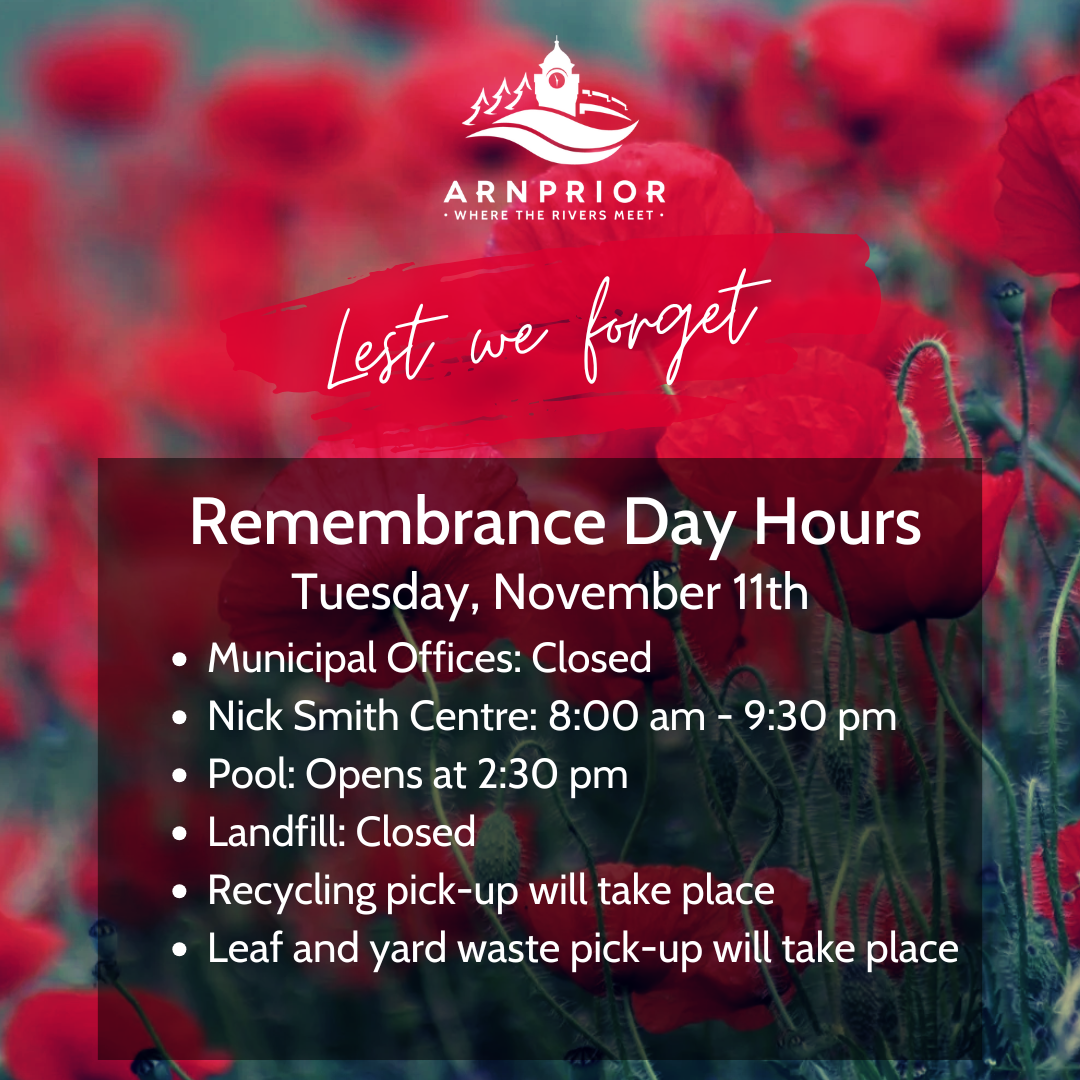 In recognition of Remembrance Day, the public is invited to join the Royal Canadian Legion Branch No. 174 at the Cenotaph located in front of Arnprior and District Memorial Hospital (350 John Street North, Arnprior, ON K7S 2P6) at 10:45 AM on Tuesday, November 11th, 2025 for the Remembrance Day Ceremony.