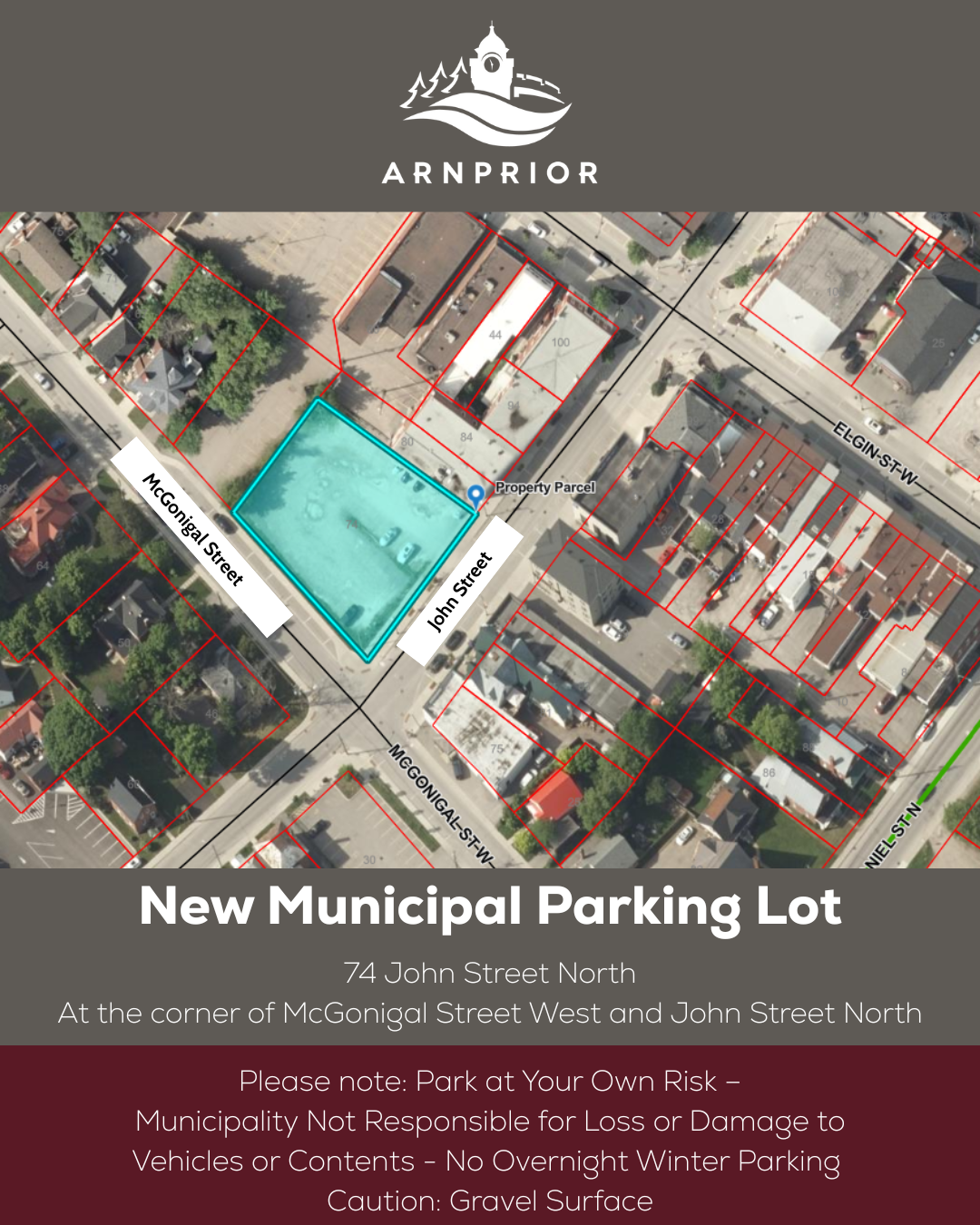 The Town is pleased to announce a new municipal parking lot Downtown Arnprior! The Town has recently purchased 74 John Street North and the lot is being re-opened as a Downtown Municipal parking lot just in time for all your last minute holiday shopping. Please note that the parking is a gravel surface and parking is at your own risk. The Municipality is not responsible for loss or damage to vehicles or contents. There is no overnight winter parking.